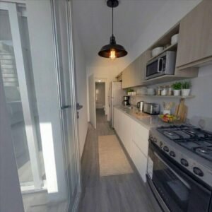 - Cocina separada con mobiliario en alto y bajo a gas, con purificador y puerta con salida al balcón, permitiendo ventilación y luz natural.